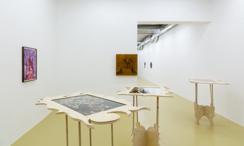 The show takes the viewer through three chapters of Damage Decoding: Archeology of the Future. The exhibition reflects on what damage has been done or might still be awaiting us through artistic practices such as film, sculpture, and painting by the artists Sophie Hundbiss, Ivana Pavlíčková, Patrik Kriššák. Throughout the exhibition, this narration evolves in the space through a gradual light concept. You enter the show and see Sophie Hundbiss film Index of Lilith on a screen. It introduces the visitor to the idea of damage as both ancient and consistent in present topics. Ephemeras of the film lead the viewer to the center and second chapter of the exhibition. Installed here are ceramic plates by Ivana Pavlíčková, arranged in a set-up that references gamer aesthetics. The plates are similar to relics that depict an antiquitized gaming culture. In the last and lightest room are dark, contrasting paintings from Patrik Kriššák. The artworks in this chapter deal with ecological damage and ask of a possible end to the narrative.